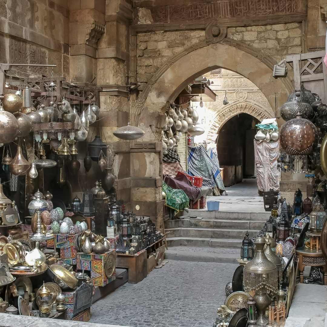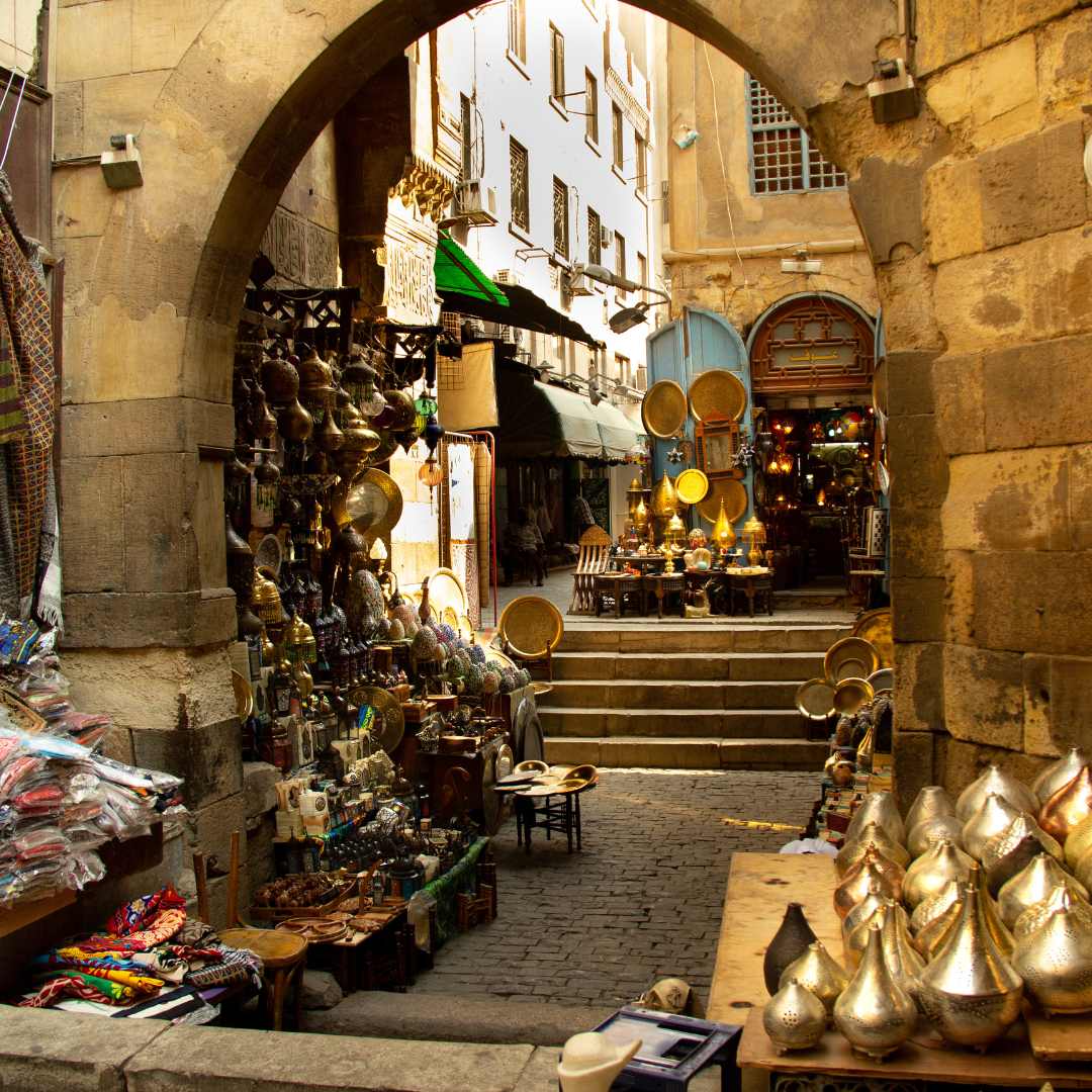 Afternoon: The Labyrinth of the Souq We continue walking towards the Khan el-Khalili Bazaar. The atmosphere shifts from historic to electric, with the scent of spices and perfumes filling the air. You will wander through the labyrinth of narrow alleys where artisans sell silver, copper, and textiles. We take a break at a historic coffeehouse to sip mint tea and watch the world go by. The Islamic Cairo and Khan el-Khalili Walking Tour is not just about sightseeing; it is about feeling the pulse of the city.